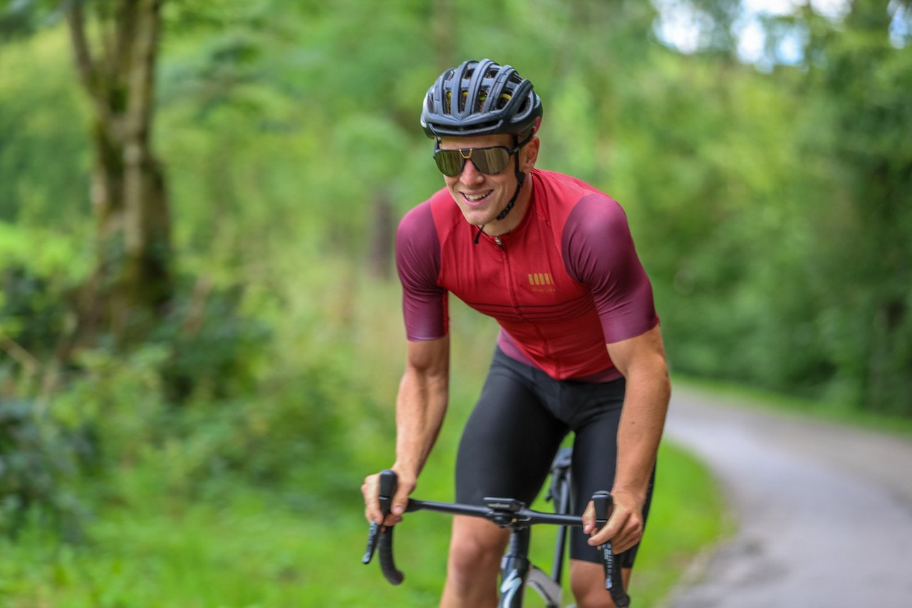 Man fietst op een bosweg, draagt een helm en zonnebril, en lacht.