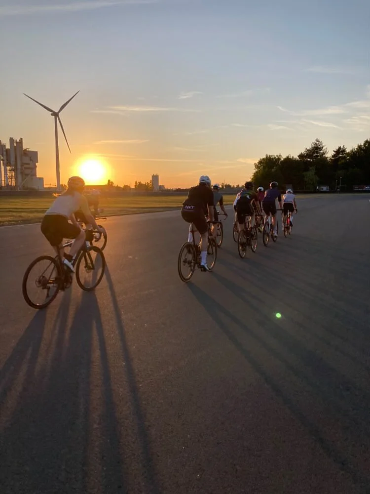 Vijf mensen fietsen op een weg bij zonsondergang, met een windturbine en industrie in de achtergrond.