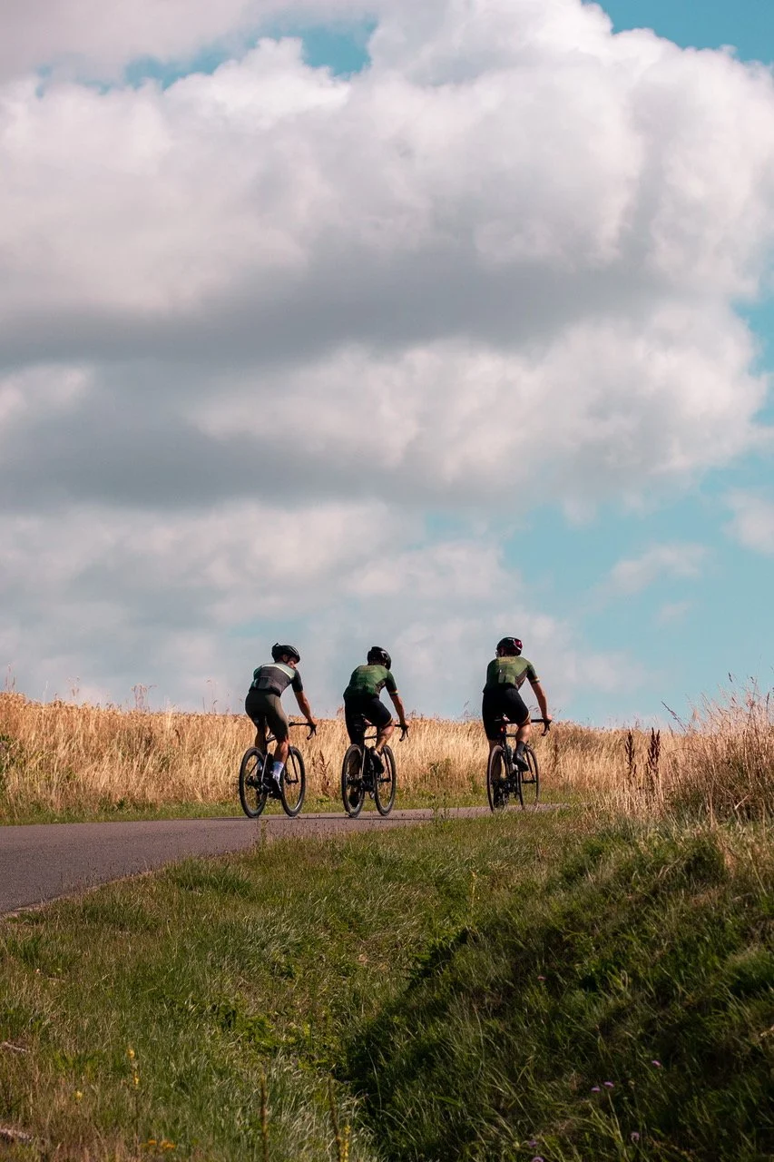 Drie fietsers fietsen op een weg in een landelijke omgeving onder een bewolkte hemel.