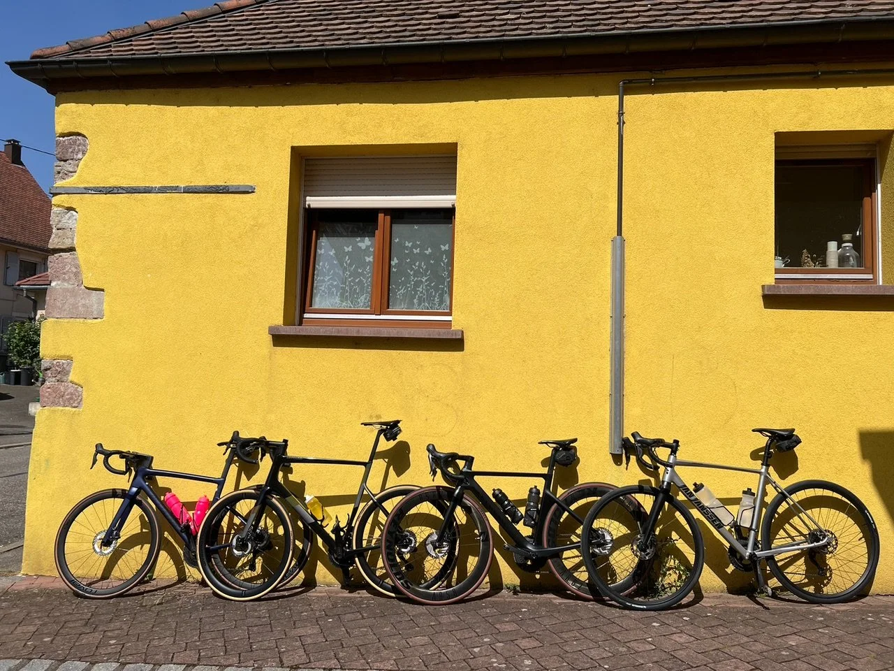 Vijf fietsen gestald tegen een gele muur met ramen, onder een dak met rode tegels, op een stenen stoep tijdens de dag.