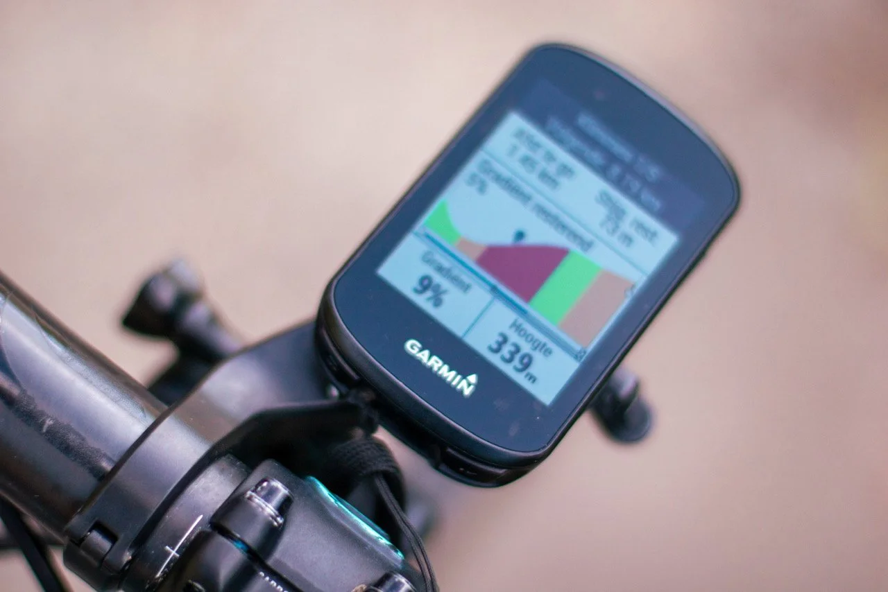 Een Garmin GPS-fietscomputer op een fiets, die hartslag, snelheid en afstand weergeeft.
