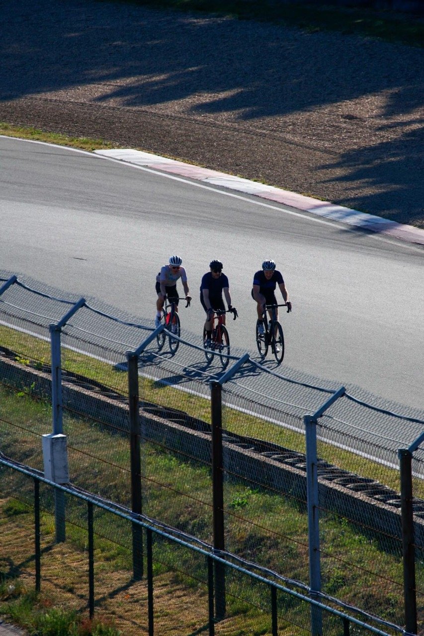 Drie fietsers op een racebaan, met een hek en een zandige helling op de achtergrond.